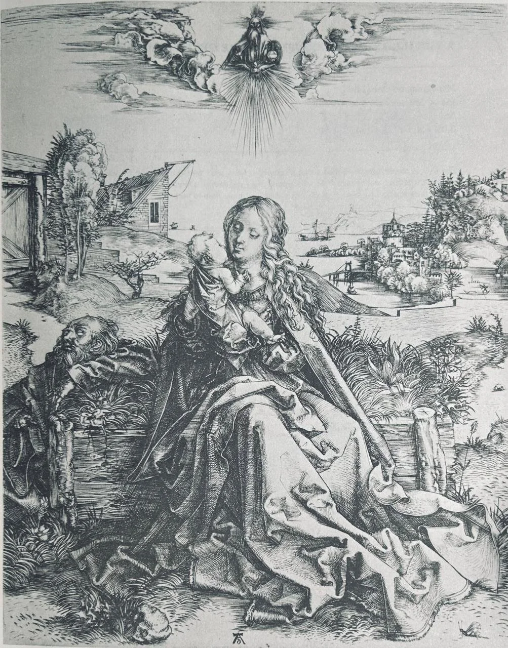 En esta entrada quisiera presentar La Virgen de la libélula o La Sagrada Familia de la mantis (saltamontes o mariposa) en el que por primera vez aparece su monograma en un grabado. En una versión arcaica podemos leer en la parte inferior de la imagen la “A” mayúscula de Albrecht y en sus barras oblicuas la “d” en minúscula. A esta obra se le atribuye la fecha circa 1495 y es considerado el tercero de sus buriles tempranos Prueba de artista - Viena, Albertinasegún Panofsky, (2) quien desconoce la autenticidad de La Conversión de San Pablo atribuido al mismo año, contraponiéndose a la opinión de otros historiadores como Winkler (Friedrich,1888-1965).