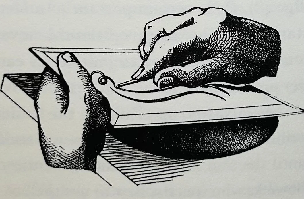 El proceso creativo, en los dos casos, parte de un dibujo. Más éste, debe ser pensado como producto final de una técnica que presenta ciertas características diferenciadas. En el grabado a buril, no se separa las etapas de su producción, como se podía hacer en las xilografías. Es decir, el artista grabador transfiere el dibujo al revés a la plancha, marca las líneas de los contornos incidiéndolas con el buril para después introducir los detalles avanzando lentamente por las diferentes áreas del plano. En este proceso se debe tener presente que la incisión sobre la plancha no debe ser pareja si es que se quiere obtener diferentes atmósferas y que mientras se manipula el buril con una mano, con la otra se va rotando la plancha que se encuentra sobre una almohadilla rellena de arena. El buril como herramienta es un pequeño cincel de acero cuadrangular con punta afilada en dirección oblicua. Esta barra va montada sobre un mango corto de madera en forma de seta que se apoya dentro del cuenco de la mano mientras se va haciendo líneas curvas o rectas.